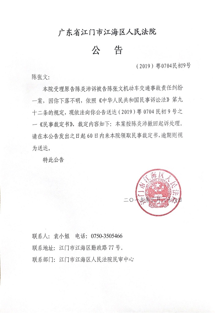 公告(2019粤0704民初9号)