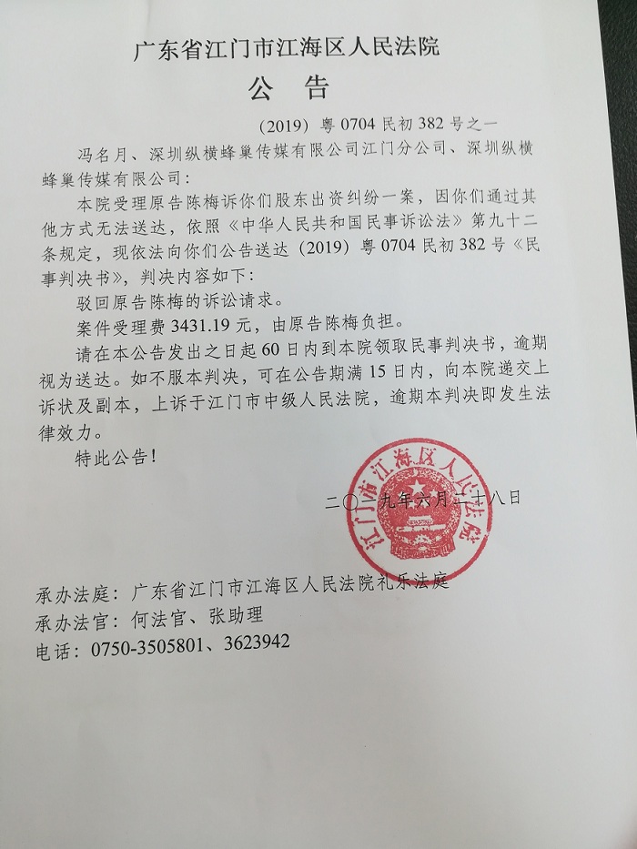 公告(2019粤0704民初382号之一)