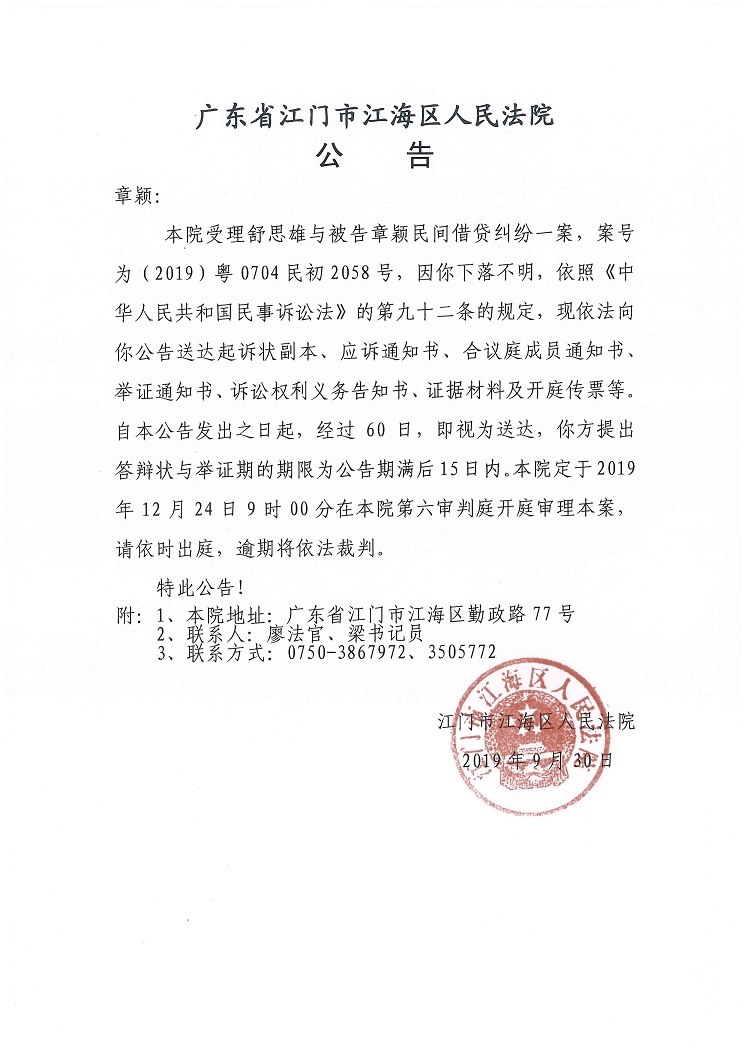 公告(2019粤0704民初2058号)