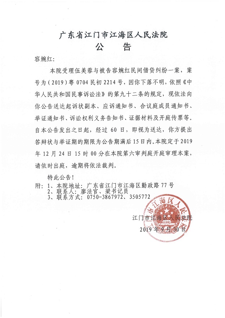 公告(2019粤0704民初2214号)