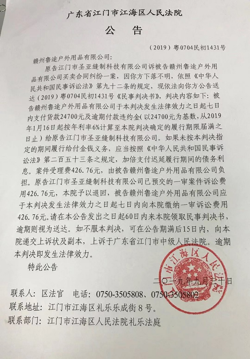 公告(2019粤0704民初1431号)