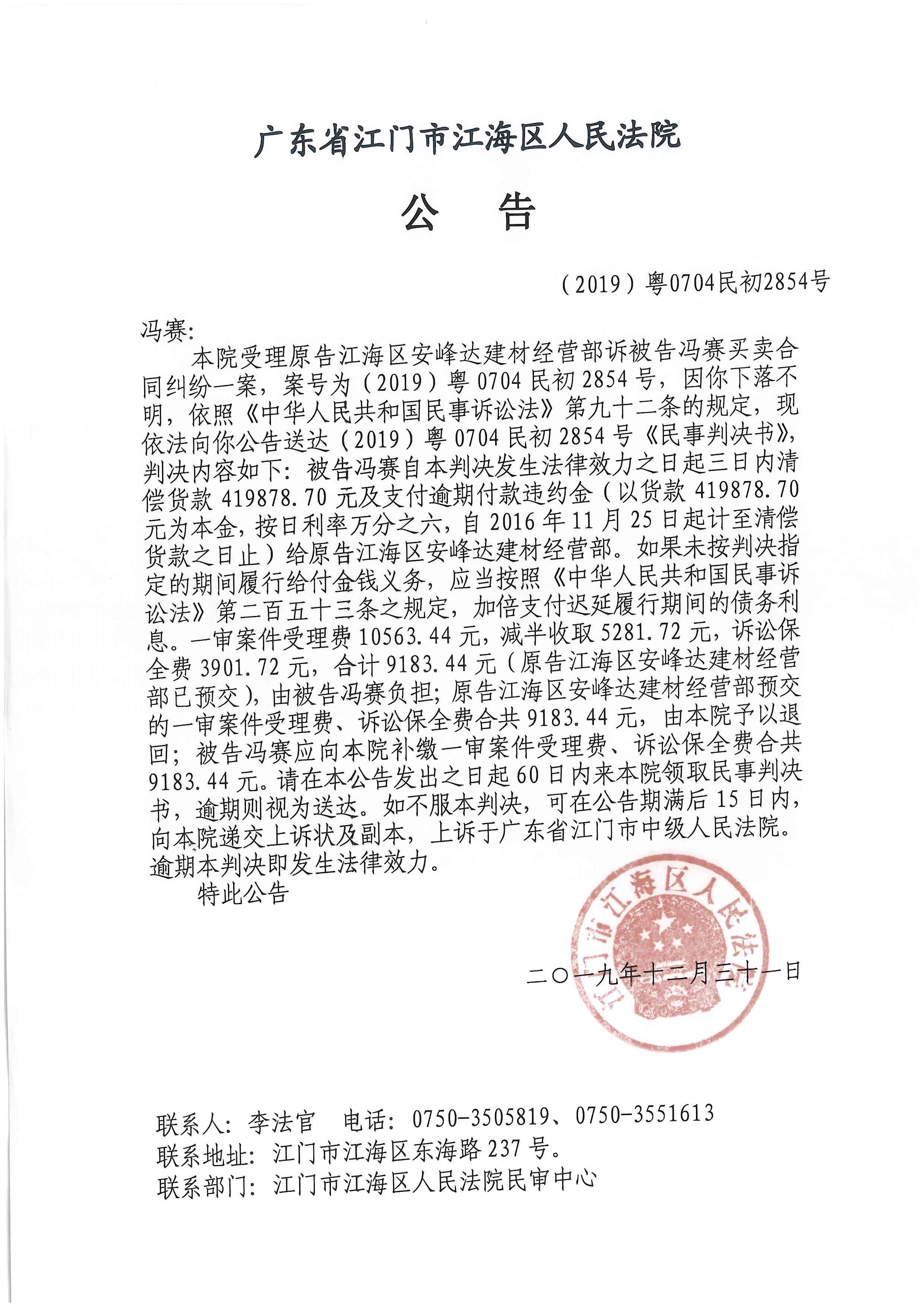 公告(2020粤0704民初2854号)
