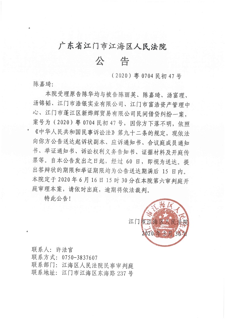 公告(2020粤0704民初47号)