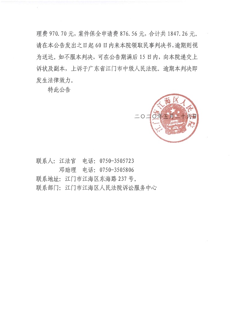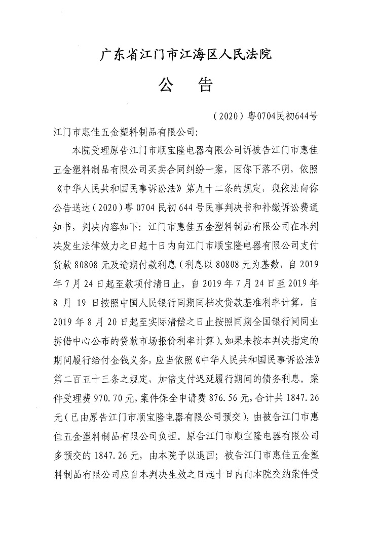 公告(2020粤0704民初644号)