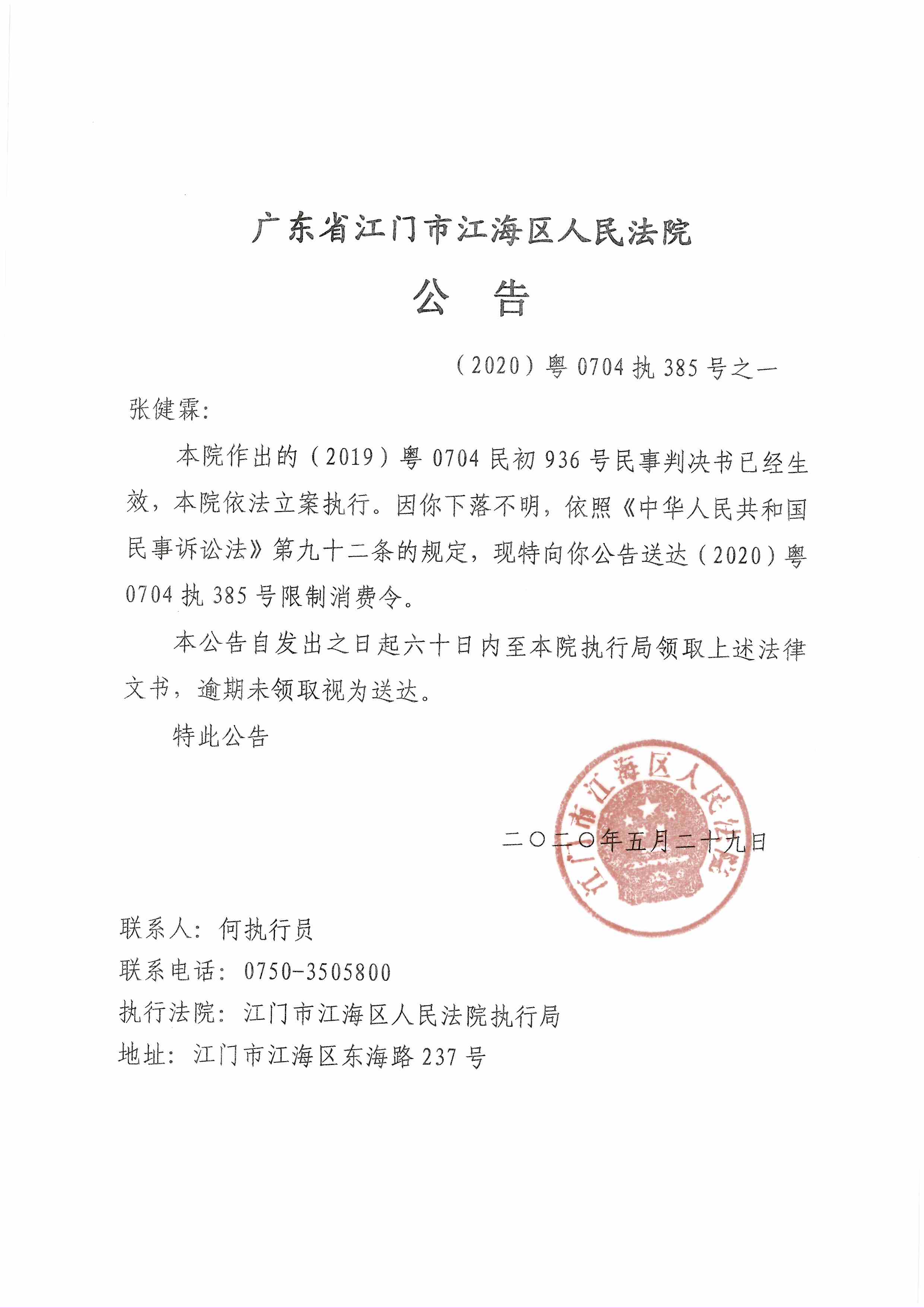 公告(2020粤0704执385号之一)