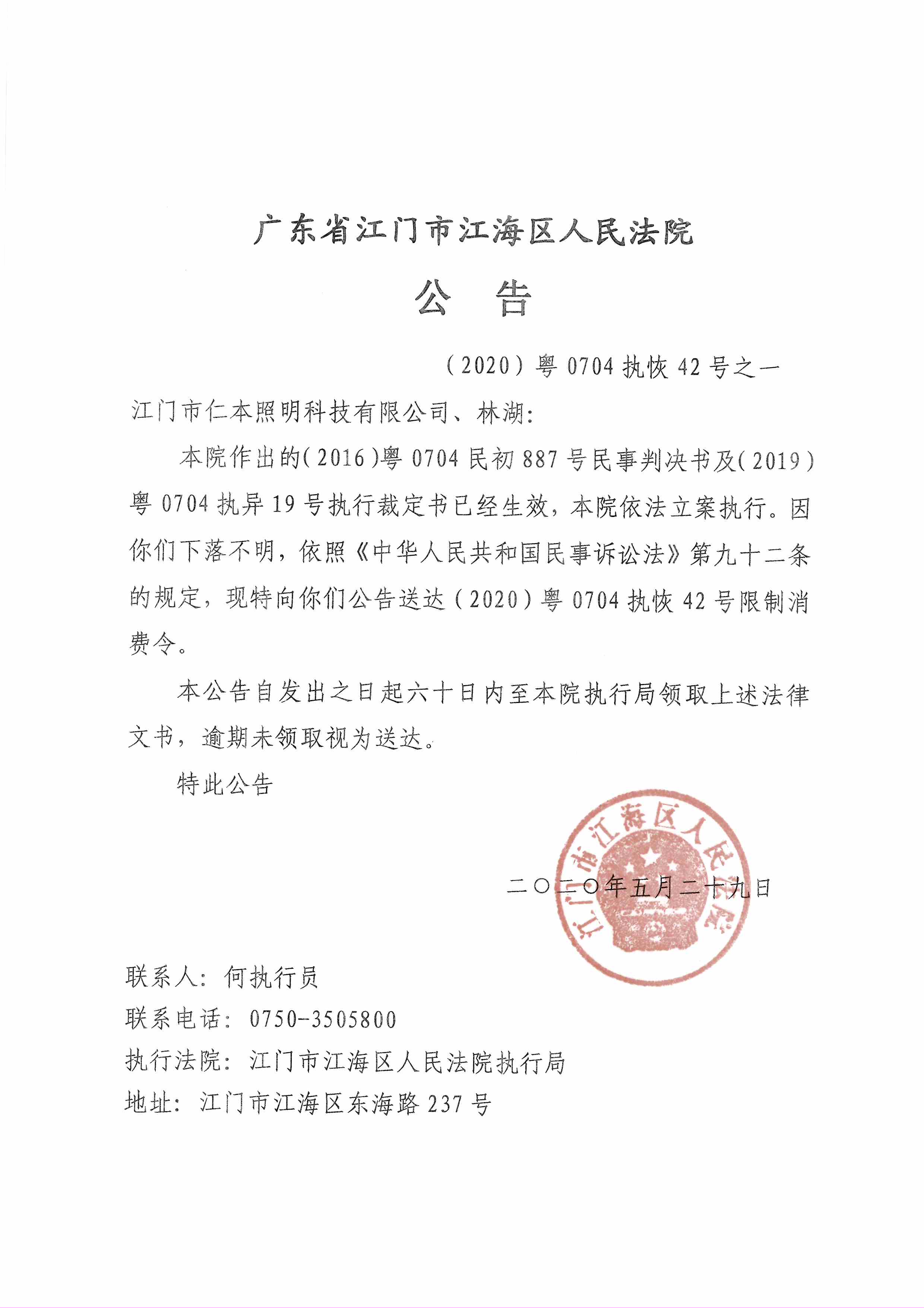 公告(2020粤0704执恢42号之一)