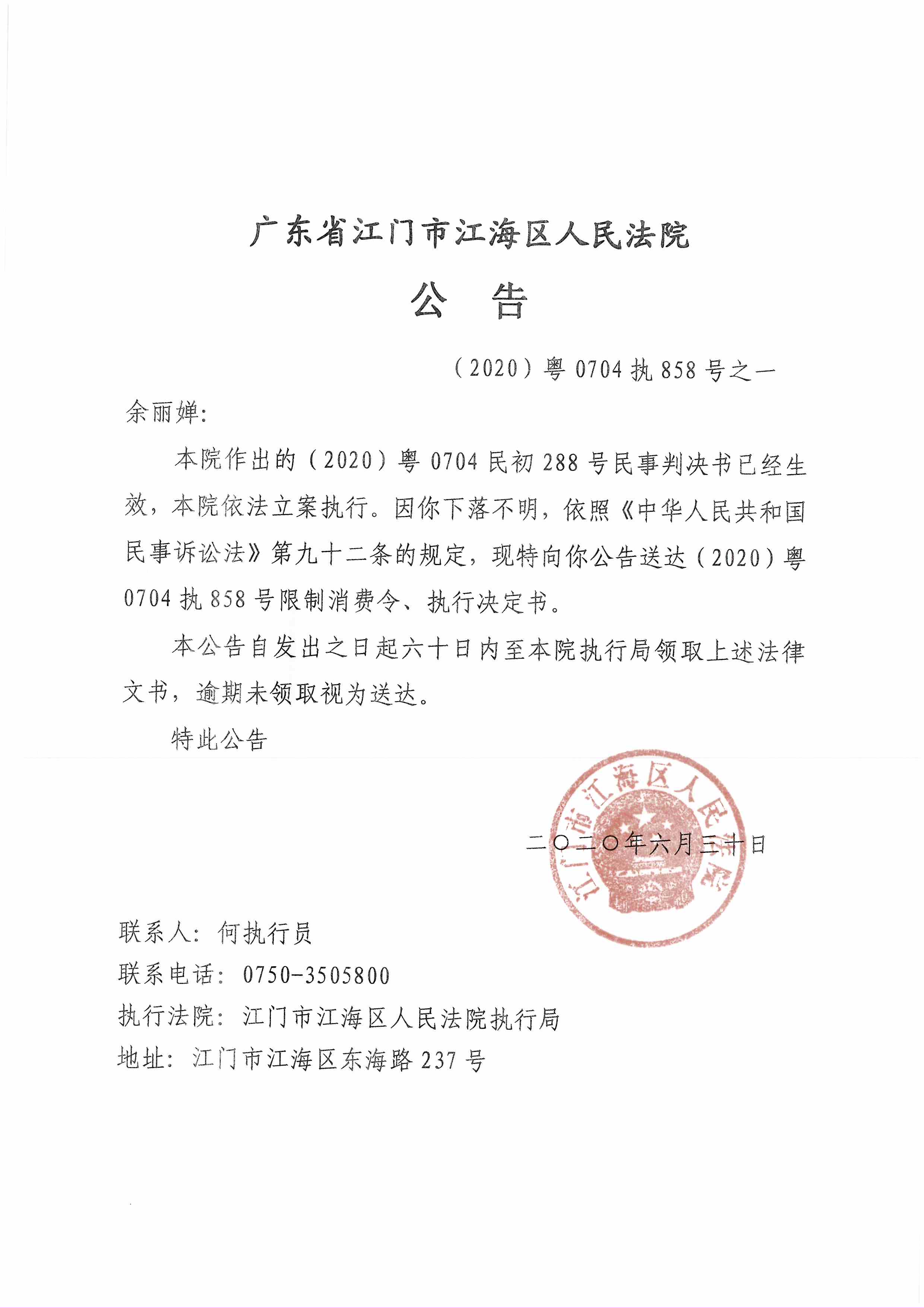 公告(2020粤0704执858号之一)