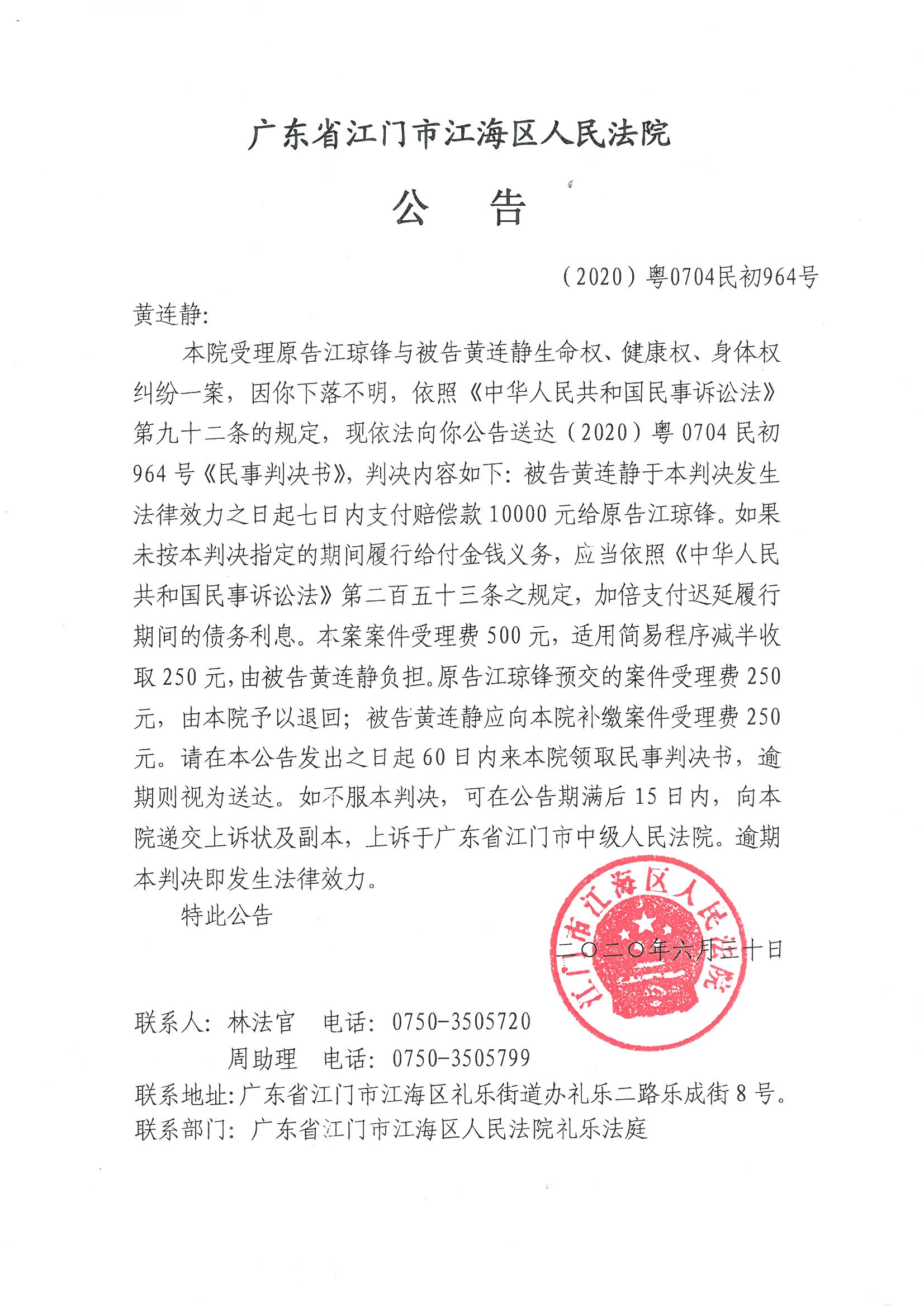 公告(2020粤0704民初964号)