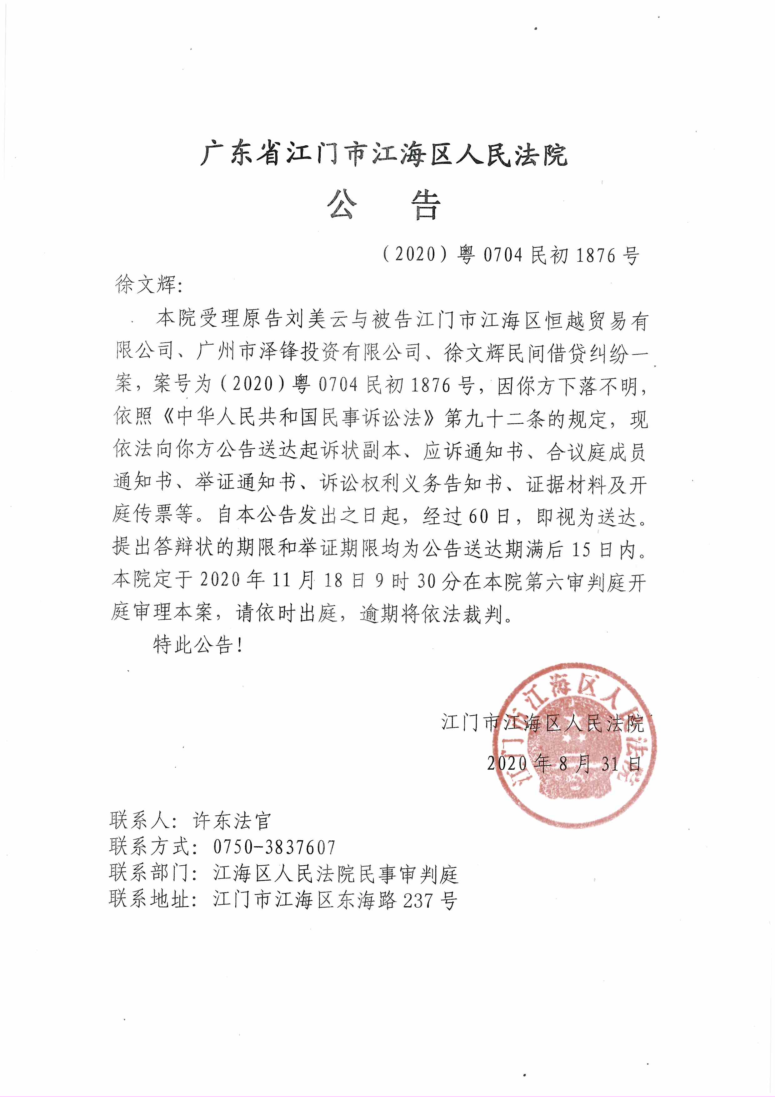 公告(2020粤0704民初1876号)