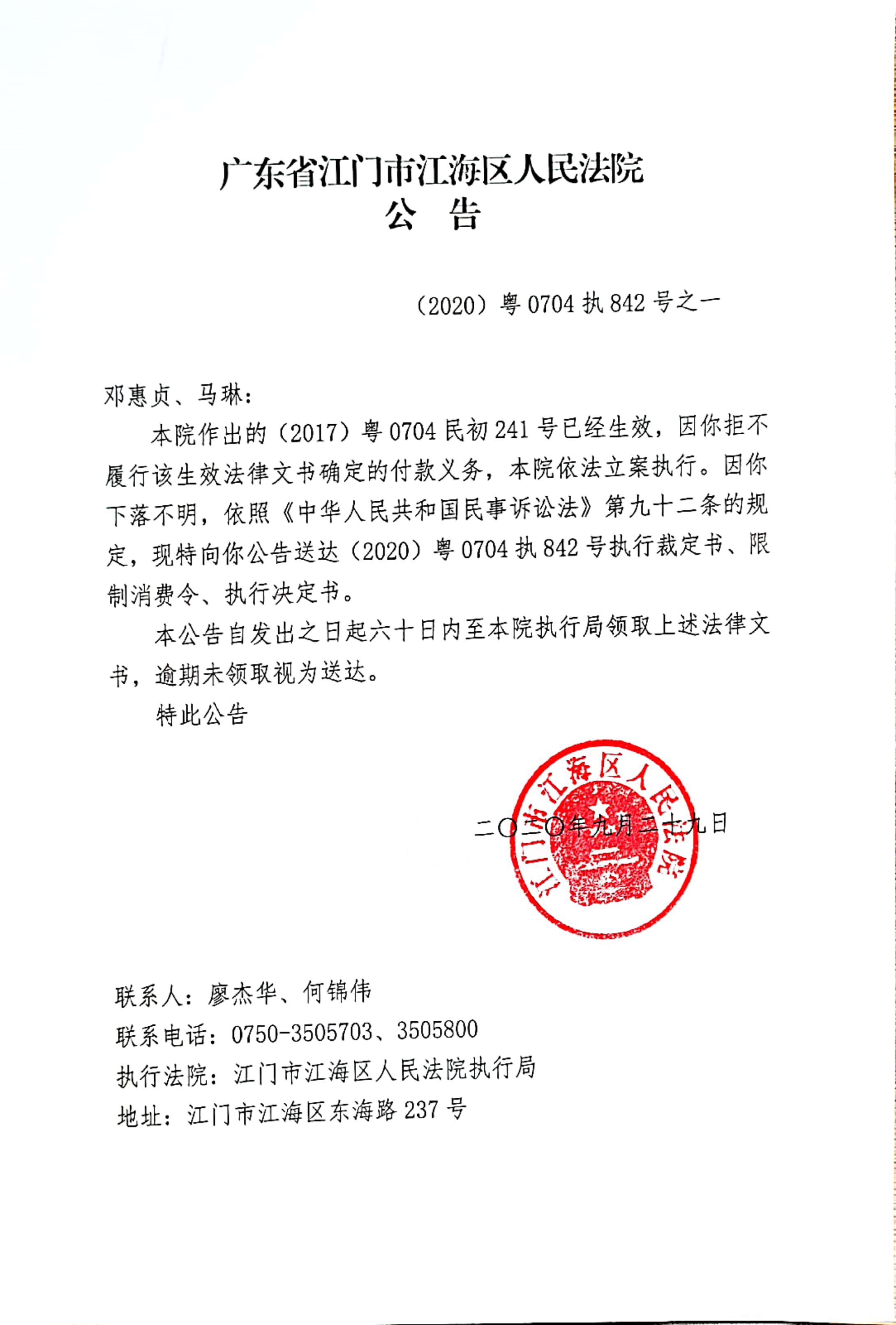 公告(2020粤0704执842号之一)