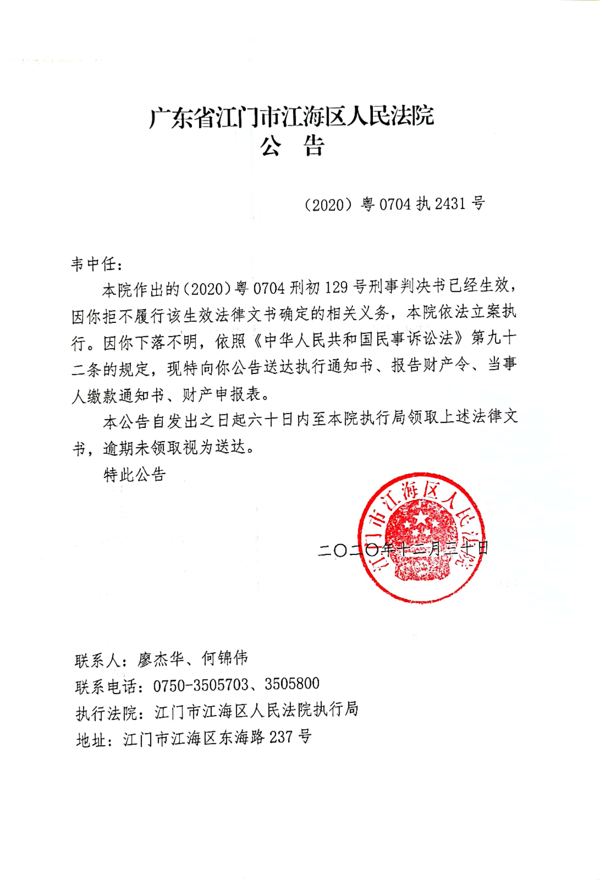 公告(2020粤0704执2431号)