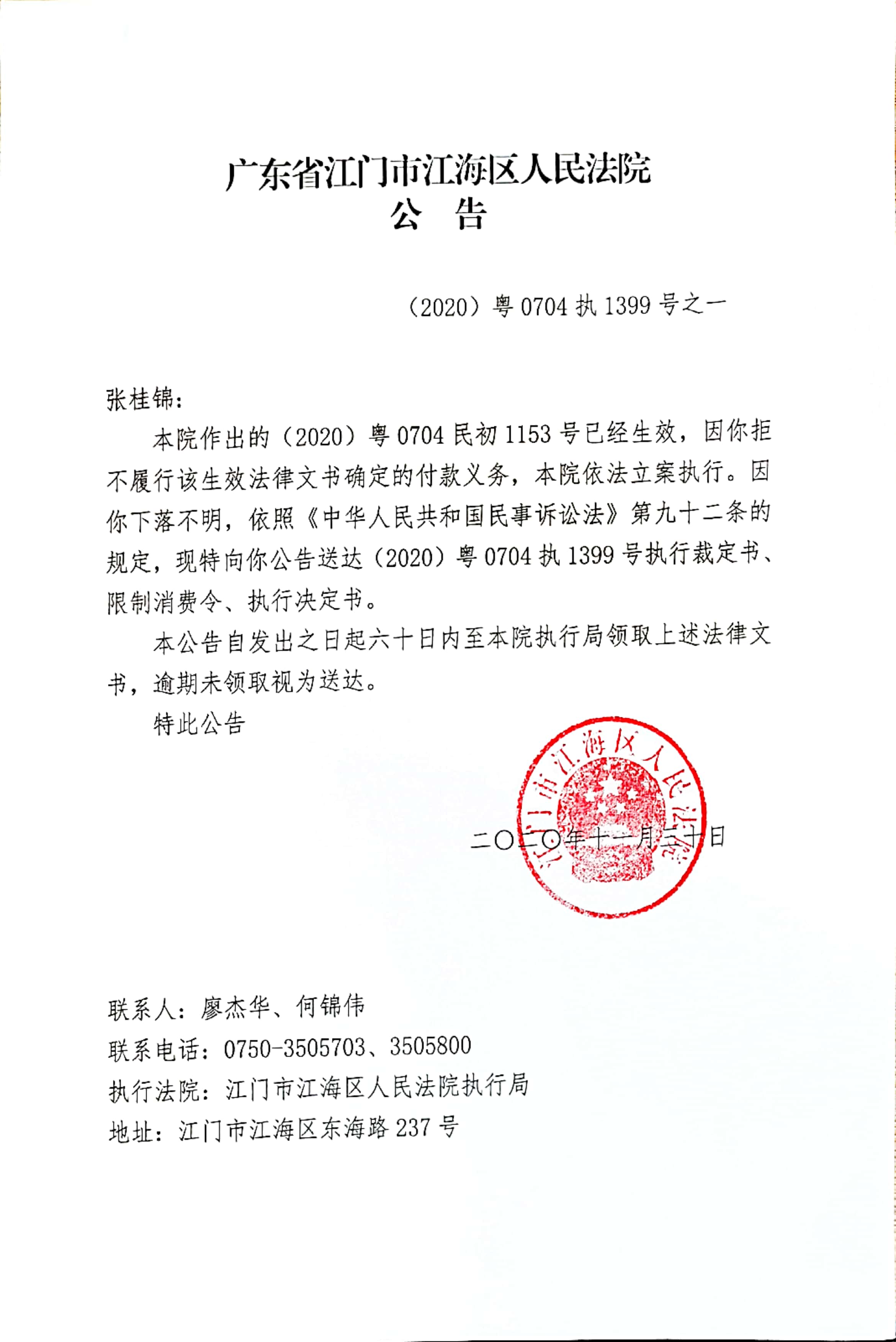 公告(2020粤0704执1399号之一)
