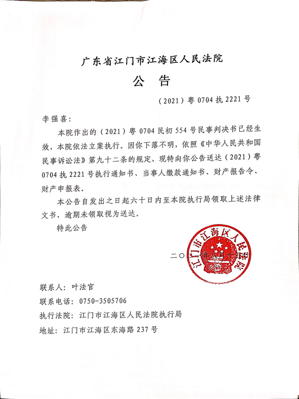 公告(2021)粤0704执2221号