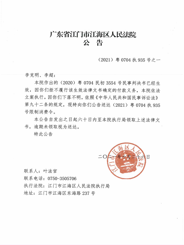 公告(2021)粤0704执935号之一