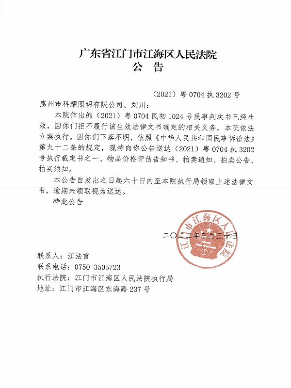 公告(2021)粤0704执3202号
