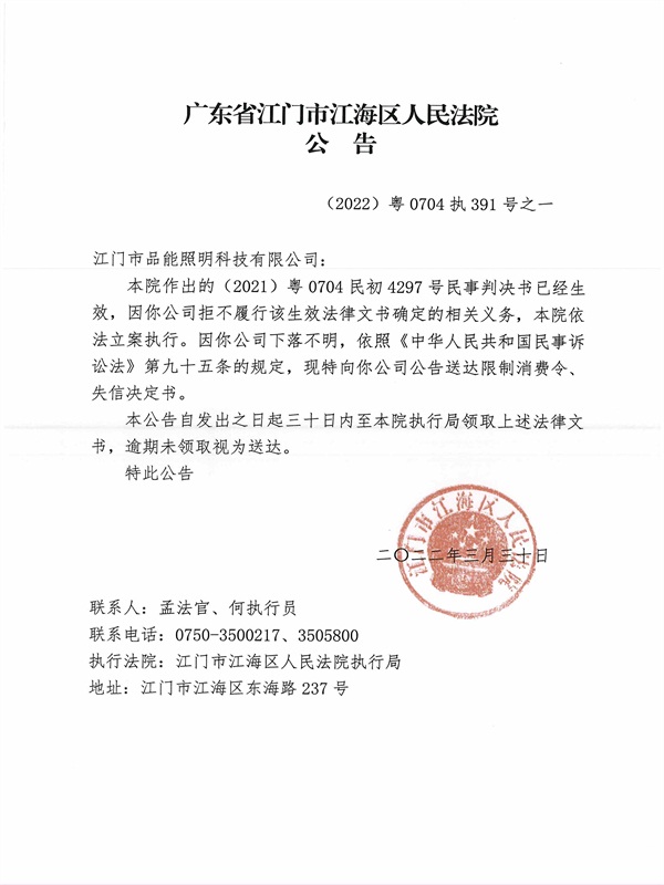 公告(2022)粤0704执391号之一