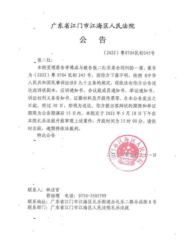 公告(2022)粤0704民初245号