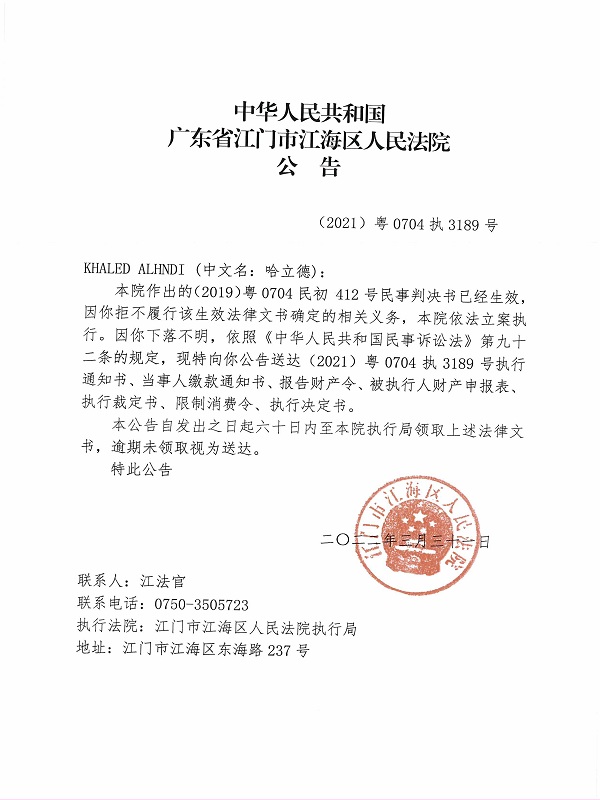 公告(2021)粤0704执3189号