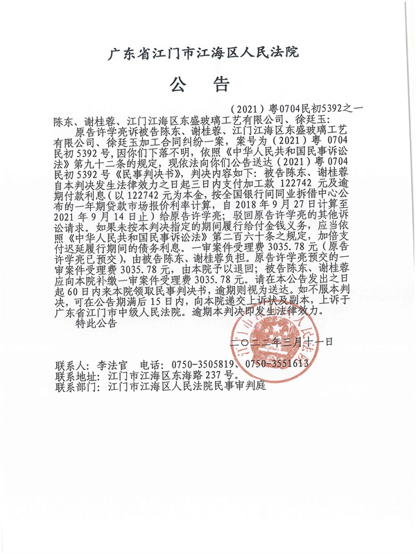 公告(2021)粤0704民初5392之一