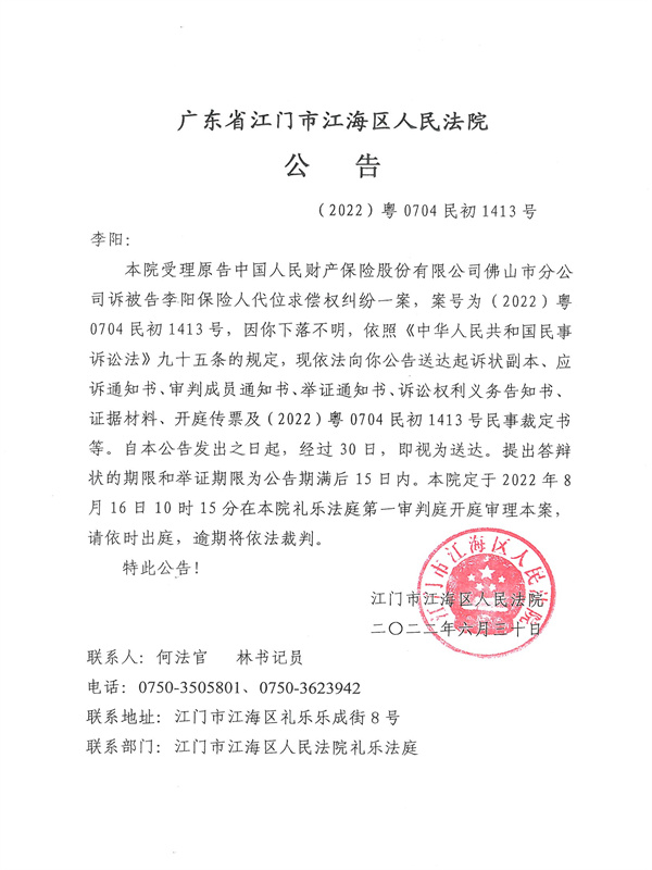 公告(2022)粤0704民初1413号