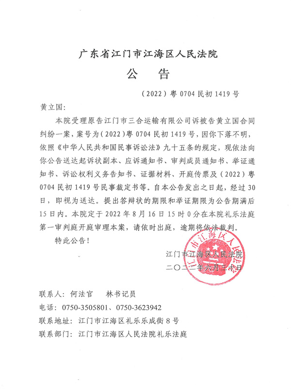 公告(2022)粤0704民初1419号