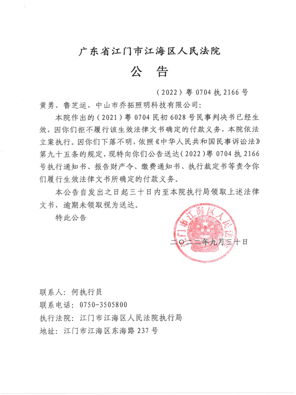 公告(2022)粤0704执2166号