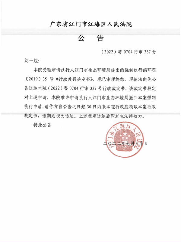 公告(2022)粤0704行审337号