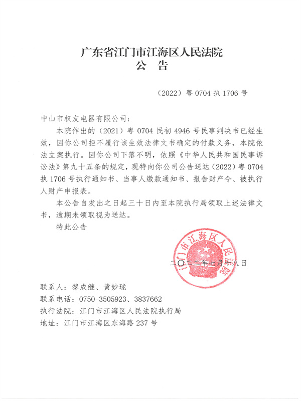 公告(2022)粤0704执1706号