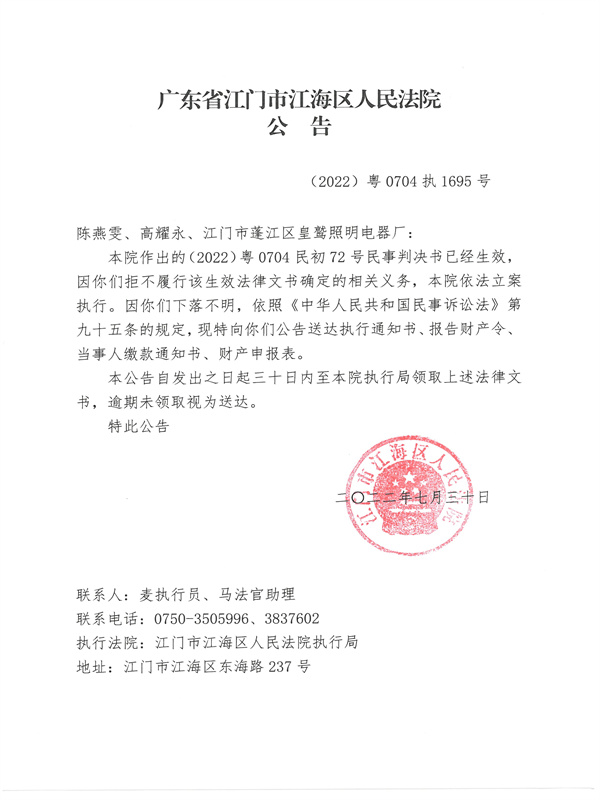 公告(2022)粤0704执1695号