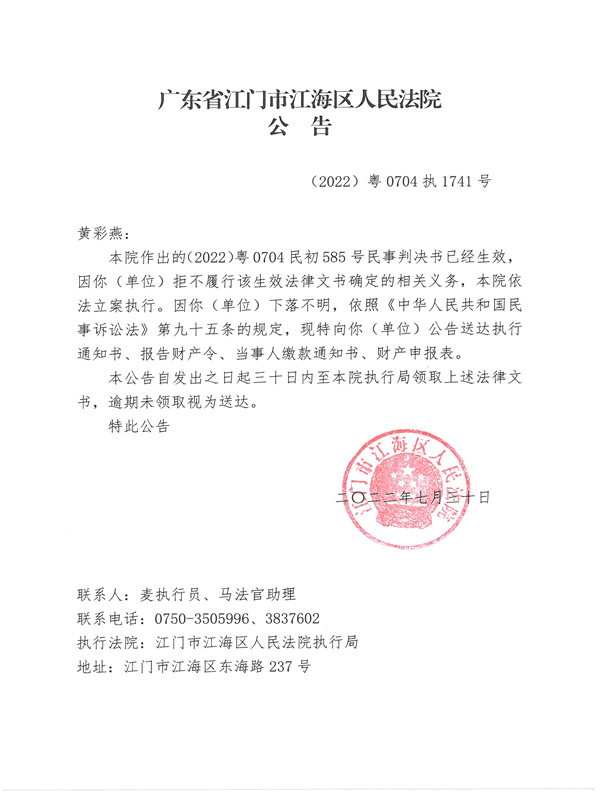 公告(2022)粤0704执1741号