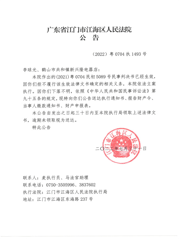 公告(2022)粤0704执1493号