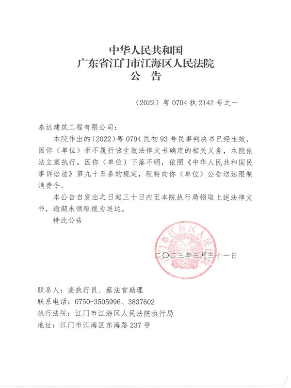 公告(2022)粤0704执2142号之一