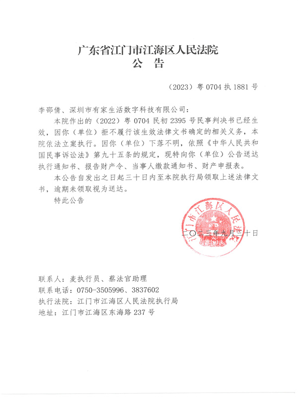 公告(2023)粤0704执1881号