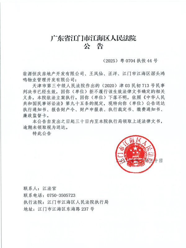 公告(2025)粤0704执恢44号