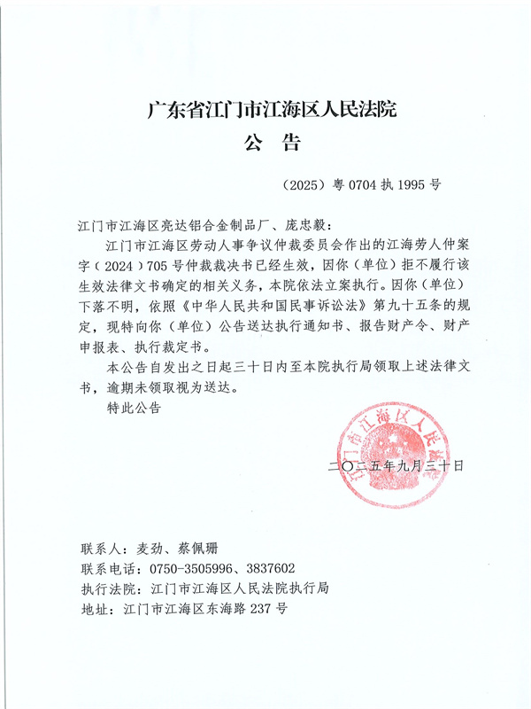 公告(2025)粤0704执1995号