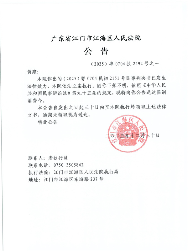 公告(2025)粤0704执2492号之一