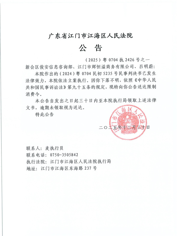 公告(2025)粤0704执2426号之一