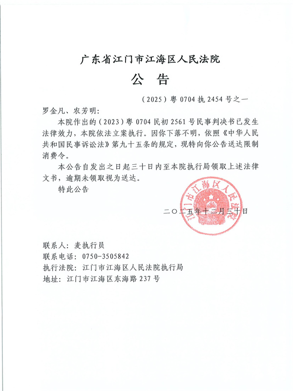 公告(2025)粤0704执2454号之一