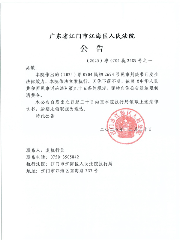 公告(2025)粤0704执2489号之一