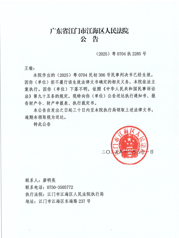 公告(2025)粤0704执2285号
