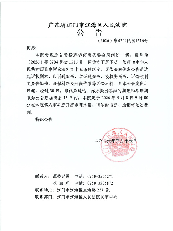 公告(2026)粤0704民初1516号