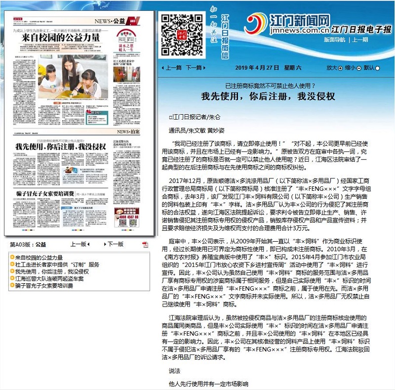 江海区法院审理后认为,虽然被控侵权商品与洁某多用品厂的注册商标核定使用的商品属同类商品,但是丰某公司实际使用“丰某”标识的时间在洁某多用品厂申请注册“丰XFENGXXX”商标之前,并且丰X公司使用的“丰X饲料”在本地区已经具有一定的影响力。因此,丰X公司在其核准经营的饲料产品上使用“丰X饲料”标识不属于侵犯洁X多用品厂享有的 “丰X FENGSHI”注册商标专用权。最终,江海区法院驳回洁X多用品厂的诉讼请求。