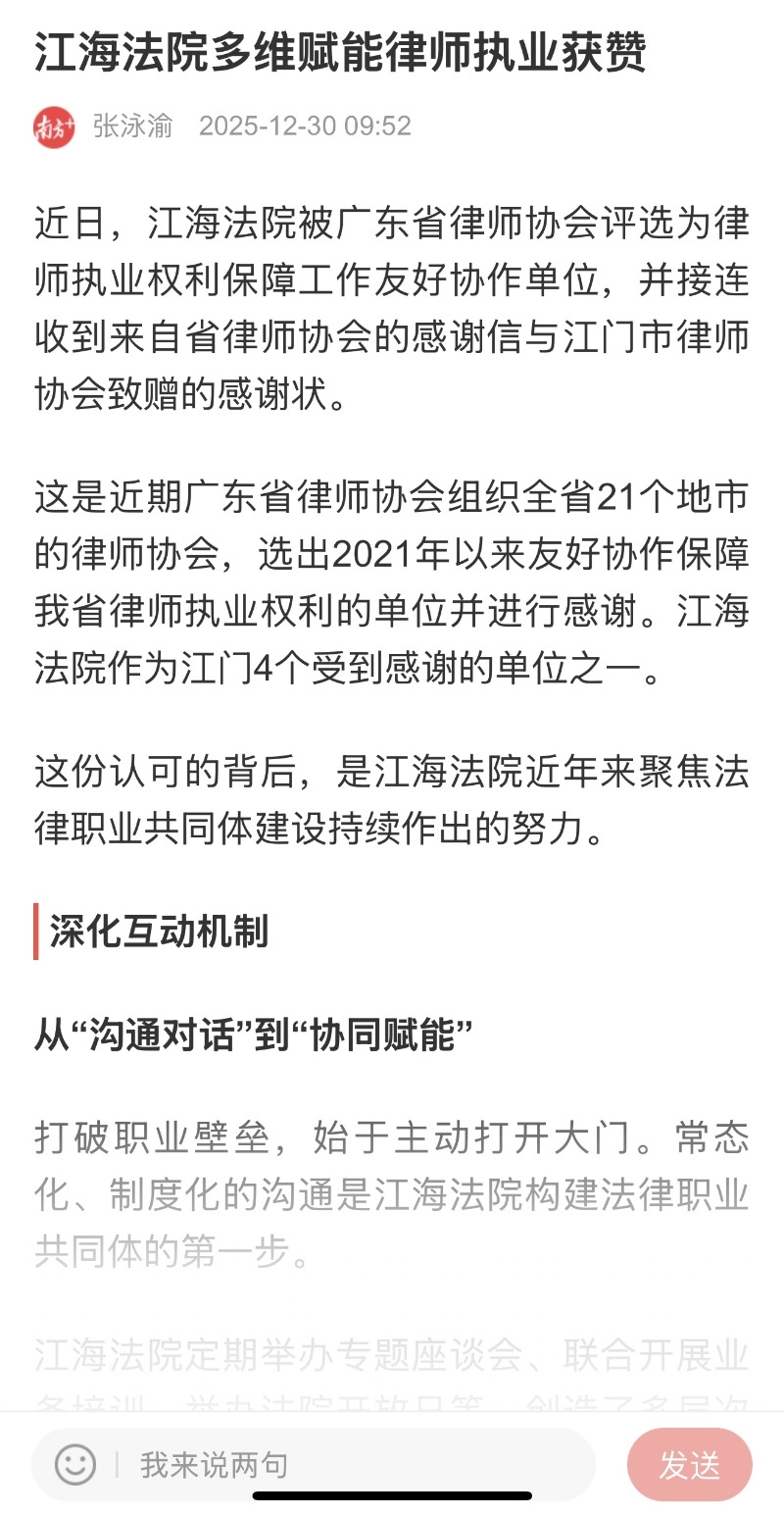 互动不止于倾听,更在于共同提升。江海法院围绕新法解读、审判实务难点、知识产权审判等主题举办法治沙龙,变单向沟通为双向赋能。在今年知识产权宣传周期间,江海法院邀请广州知识产权法院的专业法官为律师专题授课,针对人工智能生成物权属认定、移动支付技术等前沿问题,结合“新能源汽车底盘技术秘密侵权案”等典型案例,系统解构商业秘密保护边界、惩罚性赔偿适用规则等实务难点。这种基于专业追求的深度互动,有效统一了法律适用理念,为矛盾纠纷的高效、公正化解奠定了坚实基础。