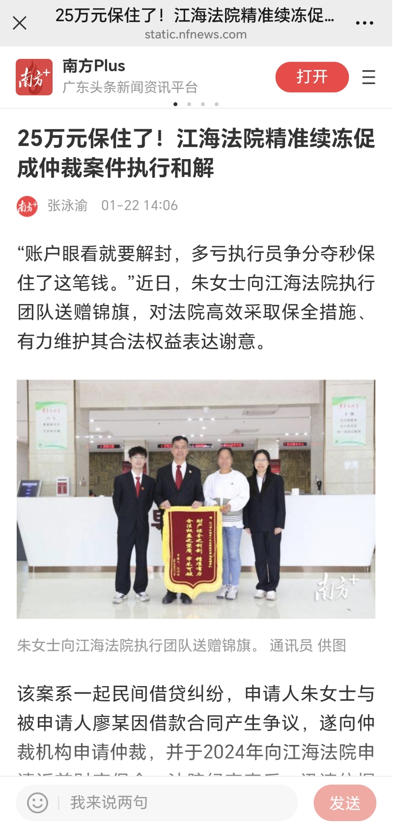 25万元保住了!江海法院精准续冻促成仲裁案件执行和解