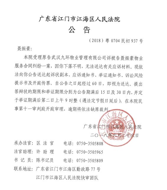 公告(2018粤0704民初937号)