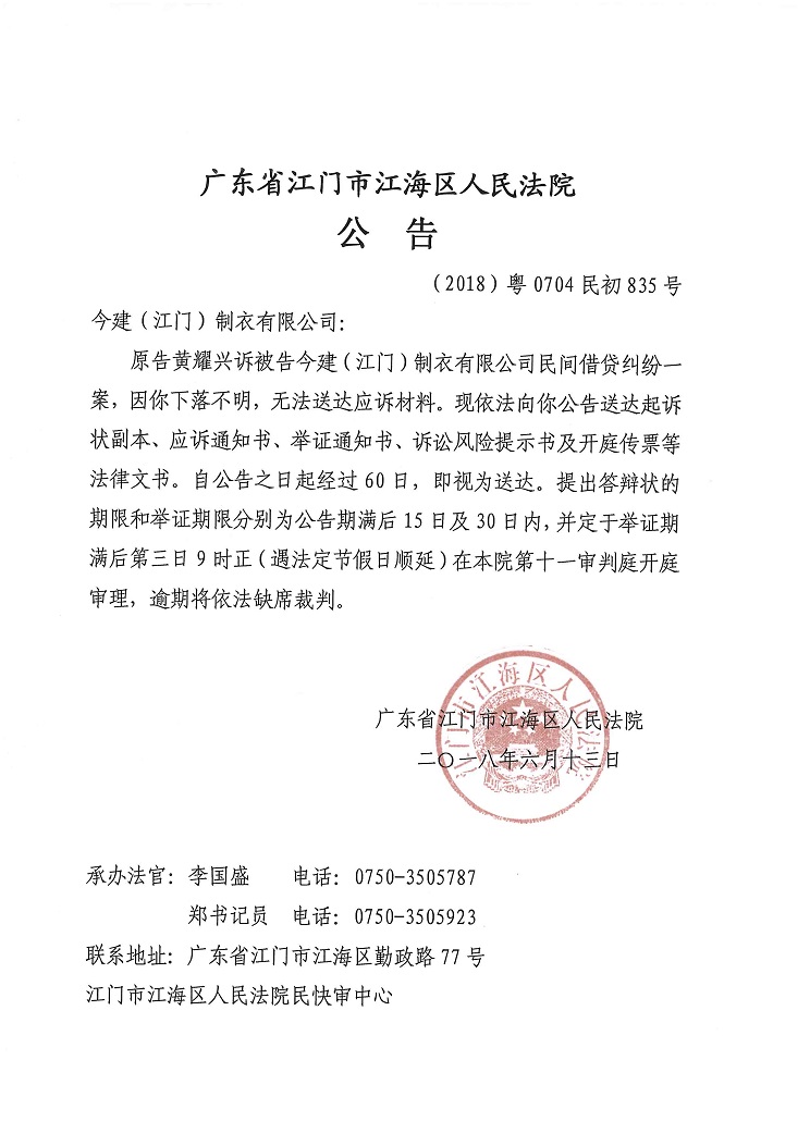 公告(2018粤0704民初835号)