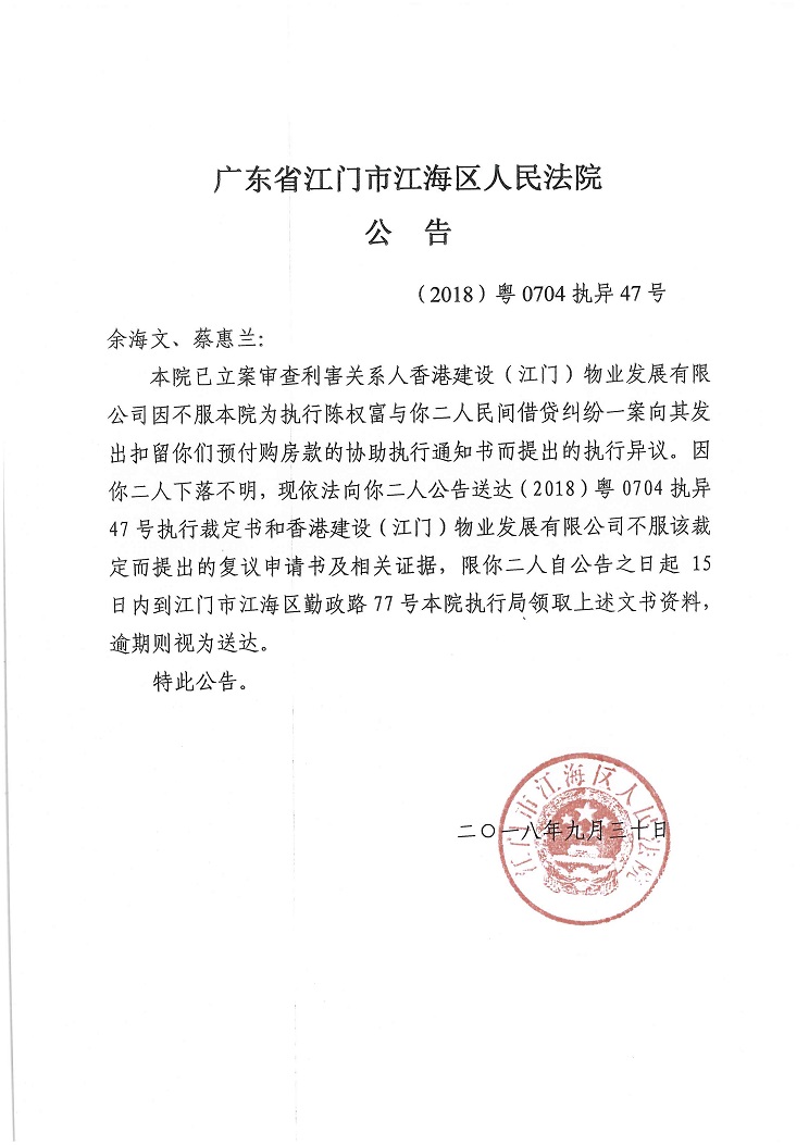 公告(2018粤0704执异47号)