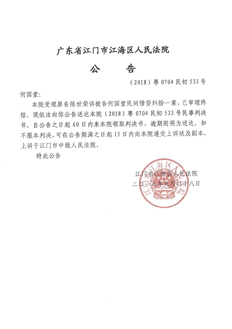 公告(2018粤0704民初533号二)