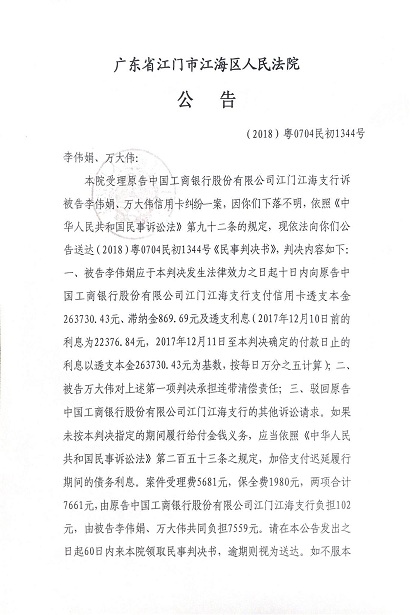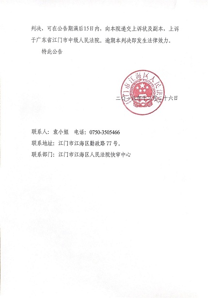 公告(2018粤0704民初1344号)