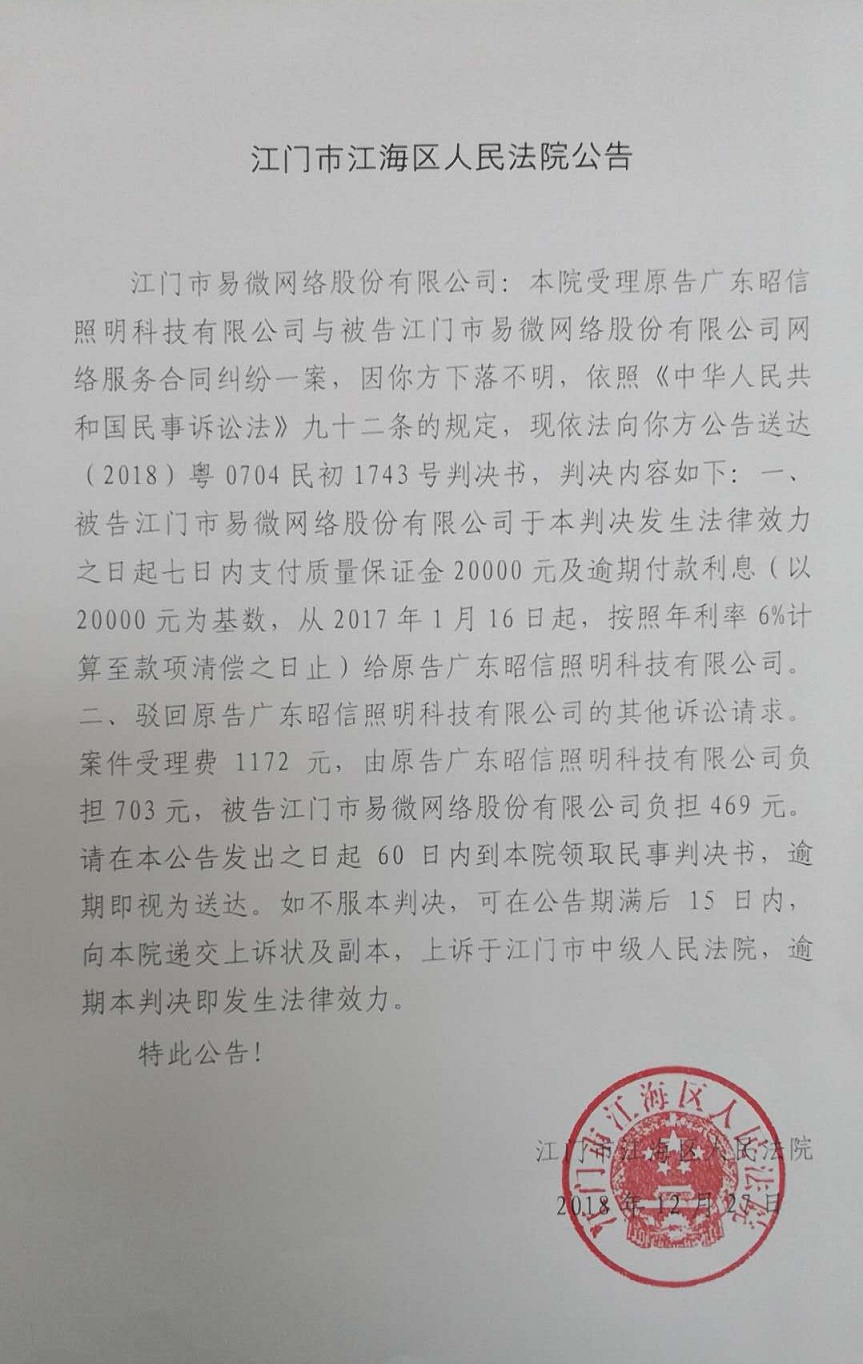 公告(2018粤0704民初1743号)